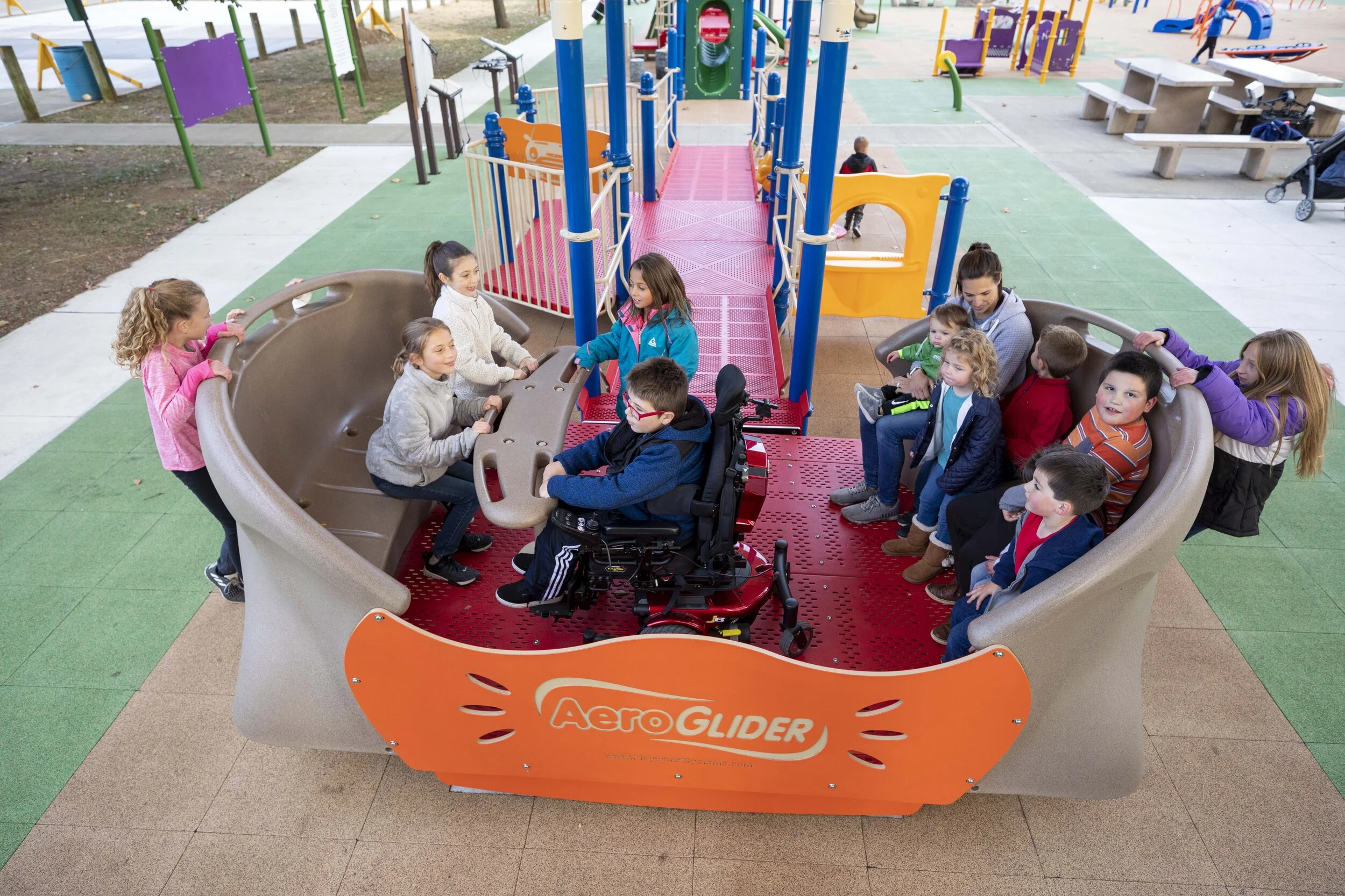EXTERIOR: Sleek, aerodynamic design screams action and fun! Unique stepping platform on both ends provides an opportunity for more kids to play and increases the swaying fun. Back high rails allow adults to help glide and get in on the fun!
