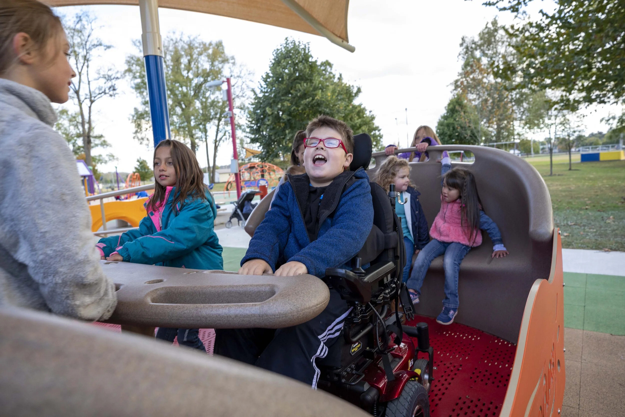 INTERIOR: Full 5’ wheelchair turning radius. Enough room for two wheelchair users to sit side-by-side. Couches on each end for children and adults to enjoy the ride. Table features comfort grip hand holds.