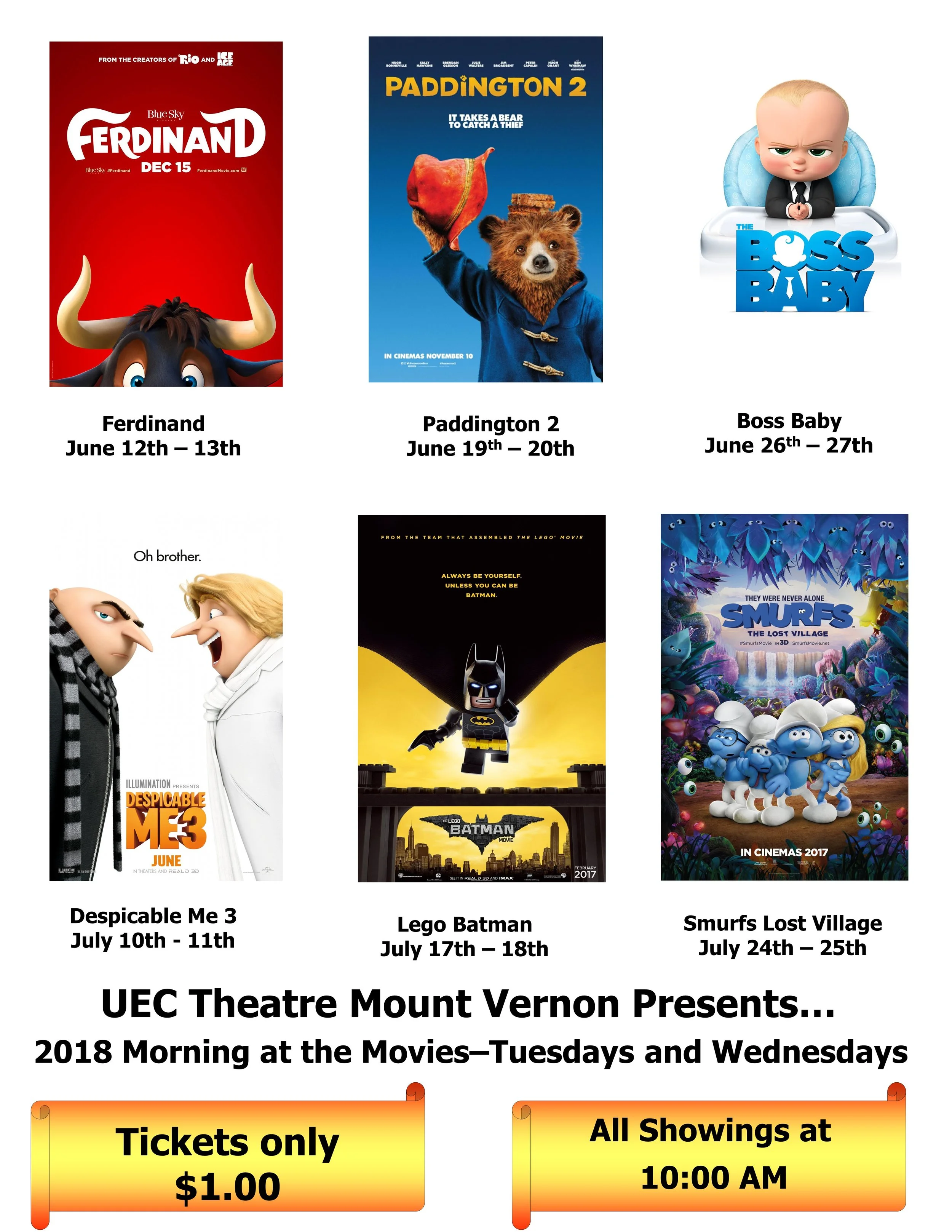 Morning at the Movies! All movies are at 10:00 AM and are only $1 admission. If you would like a sensory sensitive viewing, please contact the movie theater.